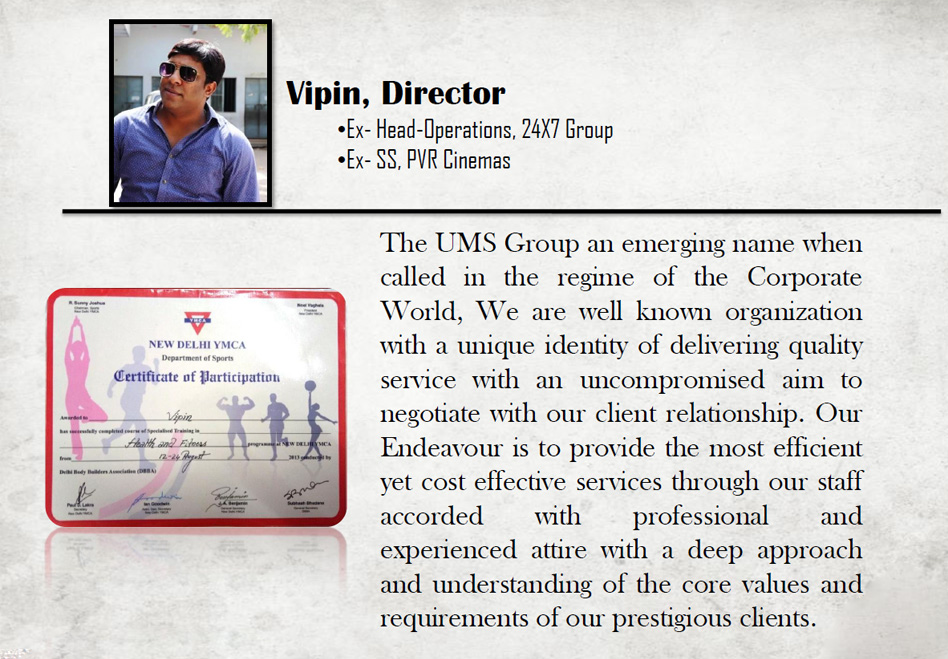 The UMS Group an emerging name when called in the regime of the Corporate World, We are well known organization with a unique identity of delivering quality service with an uncompromised aim to negotiate with our client relationship. Our Endeavour is to provide the most efficient yet cost effective services through our staff accorded with professional and experienced attire with a deep approach and understanding of the core values and requirements of our prestigious clients.